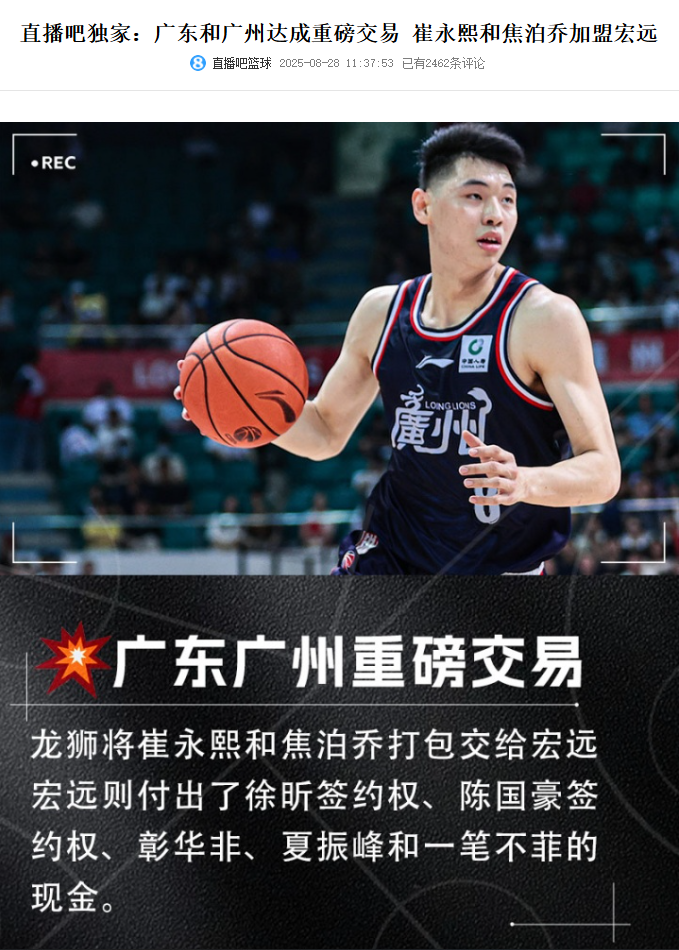 广东宏远篮球俱乐部近期完成了一系列关键球员交易及外援签约,显著提升了球队阵容实力。根据权威媒体报道,俱乐部总经理朱芳雨通过多轮谈判,与广州龙狮达成协议,成功引入国手级球员崔永熙及内线核心焦泊乔,同时送出徐昕、陈国豪等四名球员的签约权及部分现金补偿。