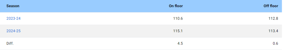 约基奇在过去四个赛季中始终领跑联盟正负值排行榜,期间掘金队在他登场时每百回合净胜分比其休战时高出惊人的20分。但防守下滑的主因恰恰发生在这位三届MVP的出场时段——2024-25赛季期间,掘金队在约基奇上场时每百回合失分较2023-24赛季多出4.5分。