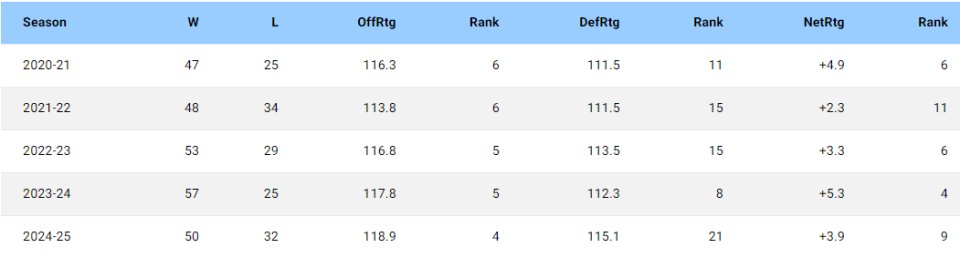 以下是掘金队最近五个赛季战绩及效率值统计: